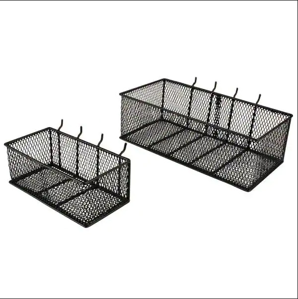 Our 2-Pack of wire mesh baskets mount to 1/8 in. and 1/4 in. peg board. They come in an 8 in. medium and 12 in. large size value pack. The wire mesh allows for smaller items to be stored without anything falling out. Rust and chip resistant.